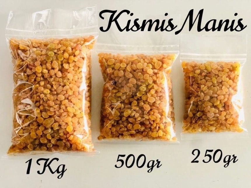 Kismis kuning (golden raisin) dengan ukuran yang lebih besar dan rasa yang lebih manis. Kemasan 250gr.