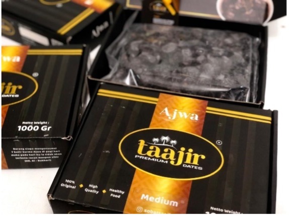 Kurma Ajwa Medium Taajir. Tekstur lembut dan rasa manis yang khas. Kemasan 1 Kg yang higienis, ideal untuk konsumsi harian.