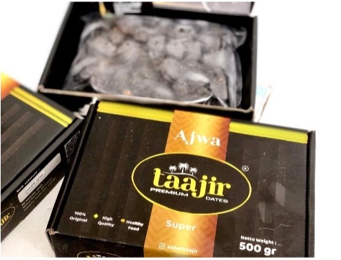 Varian Ajwa terbaik (Super/Jumbo) dari Taajir. Kurma berukuran besar, berdaging tebal, tekstur sangat lembut, dan rasa manis legit.