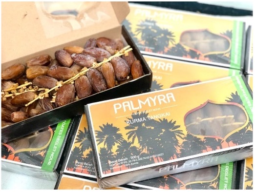 Kurma Tunis (Deglet Nour) dengan kemasan box pabrik Brand Palmyra. Kurma masih menempel pada tangkai/cabang, menunjukkan kesegaran. Rasa manis alami dan tekstur renyah.