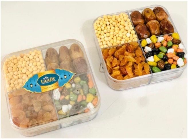 Bingkisan premium dalam Toples Sekat 4 Eksklusif. Praktis dan elegan. Isi: Kurma Sukari, Kacang Arab, Kismis, dan Coklat Kerikil. Siap ditaruh di meja tamu.
